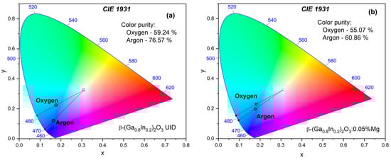 CIE 1931 chromaticity diagram for β-(Ga0.8In0.2)2O3 (a) and β-(Ga0.8In0.2)2O3:0.05%Mg (b) ceramics synthesized in oxygen and argon atmospheres.