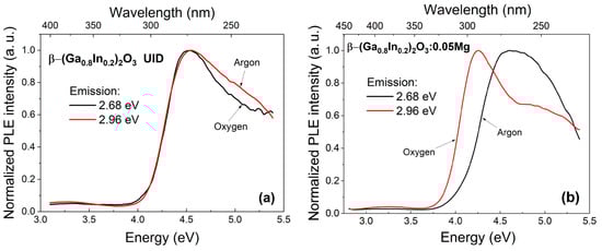 The typical PLE spectra for β-(Ga0.8In0.2)2O3 and β-(Ga0.8In0.2)2O3:Mg solid solutions synthesized either in oxygen or argon atmospheres are shown in Figure 6. These spectra are similar in the energy range of 3.0–5.5 eV due to the overlap of the elementary luminescence bands. Moreover, the excitation spectra of all elementary emission bands reach their maximum intensity at energies near ~4.5 eV for β-(Ga0.8In0.2)2O3.