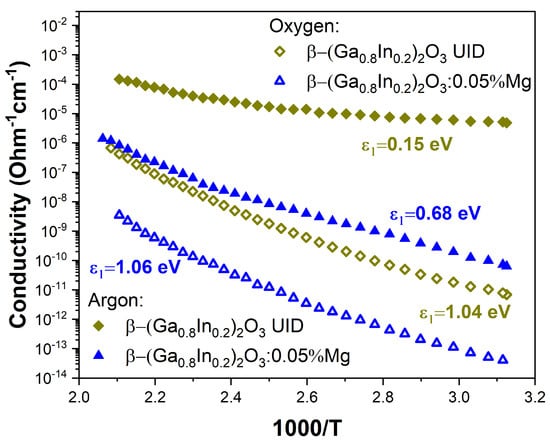 Figure 7 shows the temperature dependence of the electrical conductivity of undoped and Mg-doped β-(Ga0.8In0.2)2O3 solid solution samples. The electrical conductivity of UID and Mg-doped β-(Ga0.8In0.2)2O3 ceramics, which were synthesized in an oxygen atmosphere, was relatively low at 295 K. It varied in the range from ~1.2∙10−13 Ohm−1∙cm−1 for samples doped with Mg2+ to 5∙10−12 Ohm−1∙cm−1 for UID samples. The activation energy of electrical conductivity in such high-resistance samples was significant and was in the energy range of 1.04–1.06 eV.