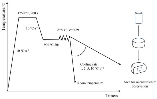 The steel ingots were processed into cylindrical specimens of 8 mm × 12 mm and subjected to plane strain compression tests on the Gleeble 3800 thermal simulation machine (Data Sciences International, Albany, NY, USA). Based on solubility theory and related studies [27,28], the thermal simulation process for the experimental steel was designed as follows: the specimens were heated to 1200 °C at a rate of 20 °C·s−1 and held for 200 s to ensure the homogenization of alloying elements. Subsequently, they were cooled to 900 °C at 10 °C·s−1 and held for 20 s to eliminate temperature gradients, followed by single-pass hot deformation. The deformation temperature was 900 °C, with a true strain of 0.69 and a strain rate of 5 s−1. The deformed specimens were cooled to room temperature at 1, 2, 5, and 10 °C·s−1. The thermal simulation process flow is illustrated in Figure 1.