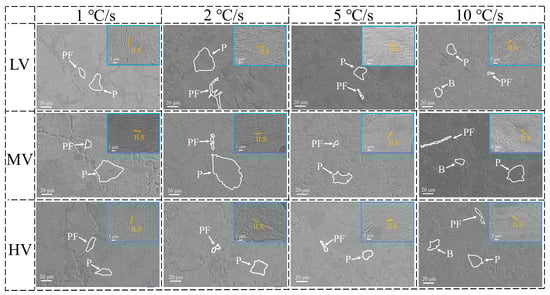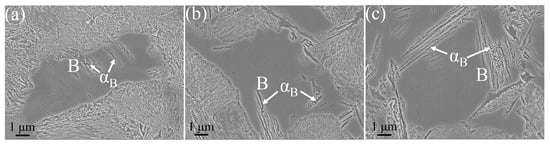 The CCT indicates that only pearlitic transformations occur in the experimental steels, with no martensitic phase transformations observed. XRD reveals the presence of solely ferritic phases in the steel, with no residual austenite detected, suggesting that the blocky structure observed may likely be bainite (B). Figure 3a–c demonstrate that increasing the V content or the cooling rate can delay the start temperature of the pearlitic transformation. As the cooling rate increases from 1 °C·s−1 to 10 °C·s−1, the start temperature of the pearlitic transformation in the LV, MV, and HV steels decreases by 93.1 °C, 66.5 °C, and 67.3 °C, respectively. Figure 4 presents bainite of the experimental steel.