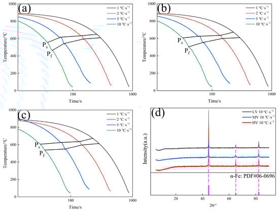 (a) CCT of LV steel; (b) CCT of MV steel; (c) CCT of HV steel; (d) XRD of experimental steels at 10 °C·s−1.