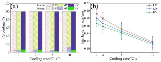 - The ILS for three experimental steels were in the order of LV > MV > HV. As the V content in the steels increased from 0.02 wt.% to 0.06 wt.%, the ILS of the experimental steels at four cooling rates (1, 2, 5, and 10 °C·s−1) decreased from 0.192, 0.178, 0.151, and 0.117 μm to 0.166, 0.157, 0.141, and 0.110 μm, respectively. At a cooling rate of 10 °C·s−1, a small amount of bainite is observed in the experimental steel, accompanied by a decrease in the content of pearlite.