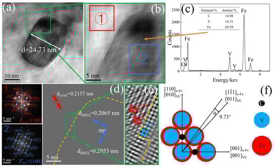 TEM of precipitates in experimental steels: (a) TEM of precipitates; (b) HRTEM of precipitates; (c) EDS of precipitates; (d) lattice fringes of precipitates; (e) magnified image of the green rectangular frame in (d); (f) two-dimensional misfit model of α-Fe and VC (① and ② are diffraction spots from area (b), yellow dash line is the interface, red and blue dots represent atoms).