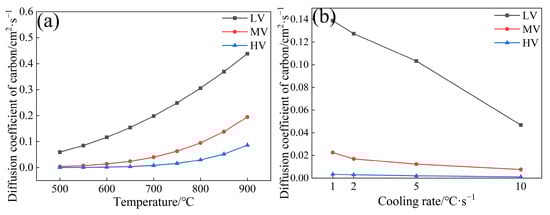 - The carbon diffusion coefficients for three experimental steels were in the order of LV > MV > HV. As the V content increased from 0.02 wt.% to 0.06 wt.%, the carbon diffusion coefficients of the experimental steel at four cooling rates (1, 2, 5, and 10 °C·s−1) decreased from 0.138, 0.127, 0.103, and 0.0467 cm2·s−1 to 3.41 × 10−3, 2.93 × 10−3, 1.95 × 10−3, and 0.98 × 10−3 cm2·s−1, respectively.