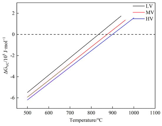 Figure 9 indicates that the critical temperatures for the three experimental steels are in the order HV > MV > LV. This suggests that increasing the V content can raise the critical precipitation temperature of VC, promoting the precipitation of VC. Yong et al., based on nucleation growth theory and the Avrami equation, derived a precipitation kinetics model (Equations (5)–(7)) [28,46,47], and calculated the variation of VC precipitation time with temperature.
