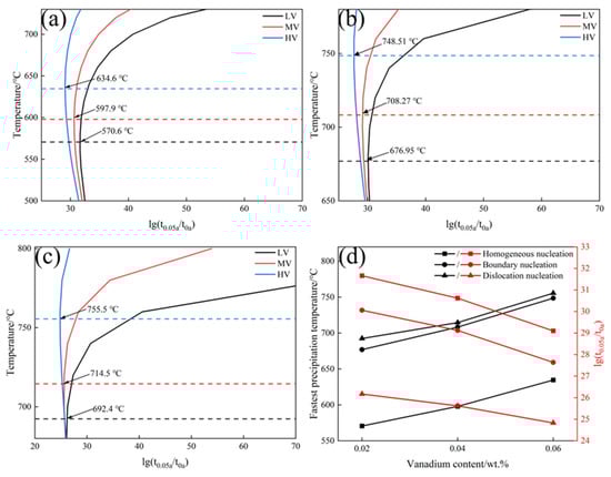 PTT curves of experimental steels with different V contents: (a) homogeneous nucleation; (b) grain boundary nucleation; (c) dislocation line nucleation; (d) critical precipitation temperatures and times for different nucleation mechanisms.