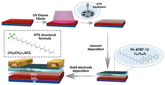 Organic semiconductors are categorized into small-molecule semiconductors and polymer semiconductors. The physicochemical properties of small molecules could be efficiently and simply regulated by their molecular structure, enabling them to be an ideal candidate in organic electrical and optoelectronic devices [5,6,7]. The organic semiconductors based on liquid crystalline molecules benzothieno[3,2b][1]benzothiophene (BTBT) cores have attracted much attention due to the high performance in OFETs and the solution method fabrication [8]. BTBT herein is an organic small-molecule material containing four consecutive aromatic rings, in which the S atom provides two π-electrons to form an aromatic six-electron body. Given that S atoms can stabilize the highest occupied molecular orbital (HOMO), the lower the HOMO energy level, the less likely the material is to undergo redox reactions, thus ensuring the stability of BTBT and its derivative materials in air [9,10,11]. The organic semiconductors based on liquid crystalline molecules’ BTBT cores have attracted much attention due to the high performance in OFETs and the solution method fabrication [12,13]. The organic semiconductor material 2-dodecyl-7-phenyl[1]benzothieno[3,2-b][1]benzothiophene (Ph-BTBT-12) has an extended conjugated structure with long alkyl chains, and proper alkylation can lead to a more compact arrangement of the conjugated skeleton, thus improving the mobility of the carriers [14,15]. Moreover, the characteristics of the active material itself and the subsequent treatments in the device preparation also play key roles in enhancing the device’s capabilities, including interface modification, annealing, and so on [16,17,18]. A self-assembled monolayer (SAM) is commonly applied in surface modification to modify the affinity energy [3,19,20,21].
