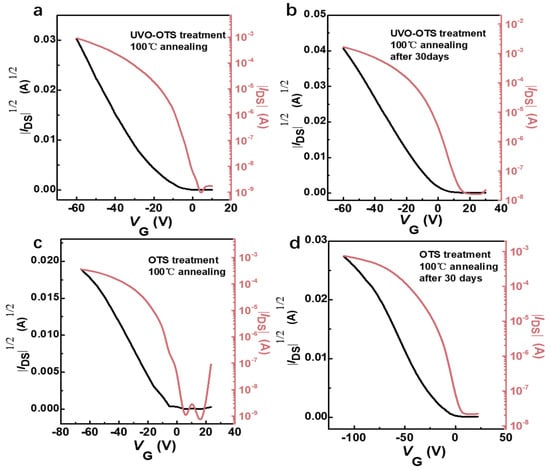 (a) Transfer curves of Ph-BTBT-12 devices after ultraviolet–ozone treatment (UVO). (b) Transfer curves of Ph-BTBT-12 devices after ultraviolet–ozone treatment (UVO) and re-tested after being placed in a nitrogen glove box environment for 30 days. (c) Transfer curves of Ph-BTBT-12 devices after OTS. (d) transfer curves of Ph-BTBT-12 devices after OTS treatment and re-tested after 30 days in a nitrogen glove box environment. All the devices were subjected to hot-bench annealing post-treatment with an annealing temperature of 100 °C and time of 10 min prior to testing.