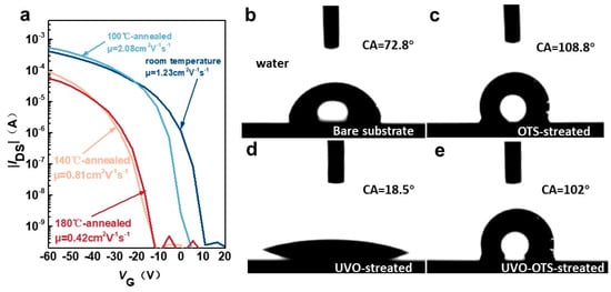 The transfer curves corresponding to various annealing conditions were examined, as shown in Figure 3a. Furthermore, the surface contact angle tests derived from various treatments were performed, as shown in Figure 3b–e. With different annealing conditions, the hole mobility of the device is different (Table 1). Self-assembled monolayer (SAM) is commonly applied in surface modification to modify the affinity energy, and the treatment helps in charge transport in organic semiconductors [43,44,45]. Octyltrichlorosilane (OTS) is one typical SAM material and is generally used in the preparation of both organic and inorganic semiconductor devices. The primary effect of OTS as a surface treatment material is to render the device surface hydrophobic. By treating the substrate with OTS, the surface affinity energy can be matched, leading to improved device performance. This is also evident in the results of our experiments [46,47]. Distilled water was dripped on the surface, and its contact angle was then collected to study the substrate surface energy, as shown in Figure 3b–e, which is extremely important for the performance of OFET devices built on this type of substrate. It was discovered that the contact angle of the UVO-OTS-treated substrate surface is lower than that of the OTS-treated substrate and higher than that of the UVO-treated substrate. Also, we discovered that it is not the case that the larger the contact angle, i.e., the more hydrophobic the surface of the device, the better its performance, which will be explained in detail later. With different annealing conditions, the hole mobility of the device is different (Table 1). We carried out the calculation of the average hole mobility of different substrate treatments on the existing data, with a total of 10 groups of samples, and finally obtained the following conclusions: the average hole mobility of the devices treated with OTS is 2.07 cm2 V−1 s−1; the average hole mobility of the devices treated with UVO-OTS is 2.31 cm2 V−1 s−1. Generally, the hole mobility first increases and then decreases with annealing temperature.