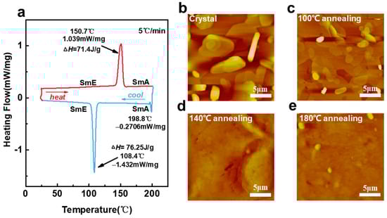 (a) The DSC curve of the device (heating rate is 5 °C/min). The AFM images at each annealing temperature (b–e) and different annealing temperatures correspond to mobilities of 1.23, 2.08, 0.81, and 0.42 cm2 V−1 s−1.