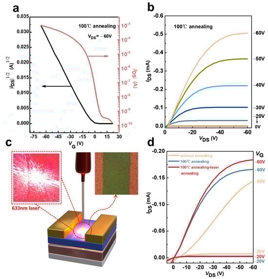 Figure 6 shows the process and performance of the devices with laser treatment. The device was thermally annealed by a heating stage at 100 °C and then cooled down. After that, the selected trench was annealed with a laser with a wavelength of 633 nm. The transfer characteristic curves and output characteristic curves of the selected device before laser annealing and during annealing at 100 °C are shown in Figure 6a,b. The spot diameter is about 40 μm (Figure S7). The output curves of the trench after laser annealing (Figure 6c) were examined and were compared to those of the same trench untreated and annealed only at 100 °C, as shown in Figure 6d. In the subsequent laser treatment, using an optical power meter, we conducted measurements to determine the laser conditions. The 633 nm laser had a laser density of 33.77 mW/cm2(this value is the average value obtained after five tests using an optical power meter). In this experiment, during the whole process of using laser annealing, the device did not move on the carrier stage, and only the Raman laser light source moved in the channel. The laser used in Raman mapping is used to scan the channel, and the dot parameters are set to ensure that the processing of the electrode channel of the device is more accurate. A laser spot is punched at every 20 μm interval with a time interval of 1s, and the laser injection time at each point is 1s. The total operating time is determined by the channel length of different components and is generally between 15 and 20 min.