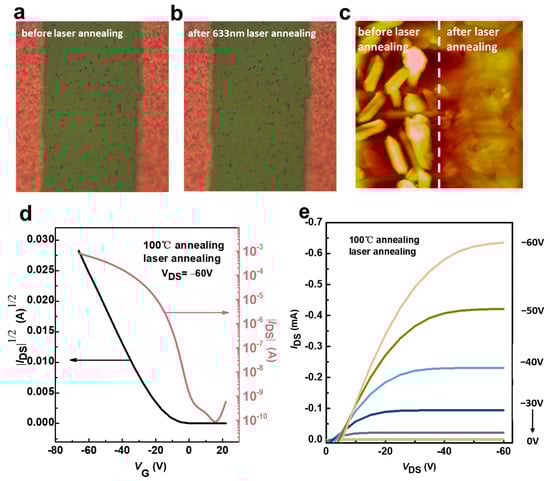 The morphologies at the channel of the device after different laser treatment conditions. (a) Without laser treatment, only thermal annealing at 100 °C; (b) after laser annealing treatment with a wavelength of 633 nm; (c) AFM comparison image before and after laser annealing at room temperature; (d,e) the output and transfer characteristic curves of laser treatment (633 nm, 100%) after thermal annealing.
