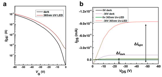 Furthermore, the photoelectric response of the device was tested, as shown in Figure 8. It is found that the FET with Ph-BTBT-12 as the active layer has an obvious induction to a UV light source with a wavelength of 365 nm, as shown in Figure 8a [64].