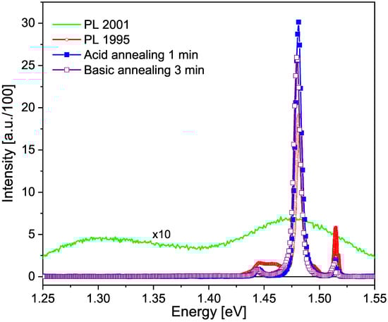 In 1995 GaAs:Sn and GaAs:Ge thick films were grown on a GaAs substrate oriented in the (100) direction by Liquid Phase Epitaxy and at a temperature of 800 °C. The materials and their purity were Ga(7N), Ge(5N), Sn(5N) and GaAs to obtain As [15]. As can be seen, the resulting films will contain native VAs and interstitial Ga defects due to an excess of Ga [16]. The samples were thermally annealed at 620 °C for 4 h in a H2 environment to facilitate crystalline ordering and avoid deep defects or traps. The films were built up to an average thickness of 10 m. The Ge concentrations ranged from cm−3 to cm−3 and the Sn concentrations ranged from cm−3 to cm−3, which were measured by the capacitance-voltage method. After photoluminescence and photoreflectance measurements, the samples were stored for six years in a dry and dark environment. In 2001, Fonthal [17] also measured photoluminescence and photoreflectance and proposed that the variations in these spectra were due to new vacancies added to the films by the reactivity of O2 to form Ga2O3 and As2O3, the latter being volatile. He proved the hypothesis by chemically pickling part of the samples and obtaining the original spectra measured in 1995. Figure 1 shows this result.