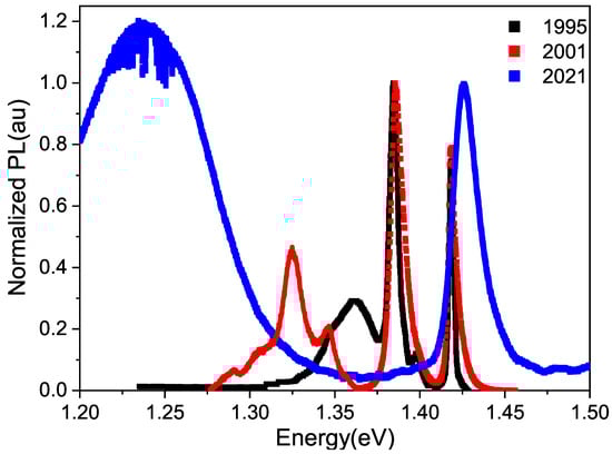 Normalized photoluminescence spectra obtained using a 488 nm laser at a temperature of 300 K, taken on different dates for an undoped GaAs sample. Spectrum in black taken from reference [15] and in red taken from [17].
