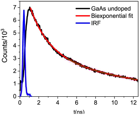 The TRPL response from an undoped GaAs sample (black line) is shown. The IRF (blue line) and the fit using a biexponential function (red line) are also displayed.
