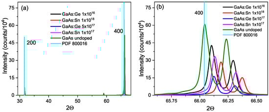Figure 4a shows the X-ray diffractograms for the undoped GaAs sample and four doped samples. The first information that can be gleaned from these diffractograms is that all five samples are indeed GaAs, as confirmed by comparison with PDF 800016. Figure 4b reveals that, for each colored peak representing the diffractogram of a different sample, there is a shift towards larger angles as the doping concentration increases. In addition, each peak of the (400) line has a smaller satellite on the side of larger angles, which corresponds to the response for the K line, = 1.5444 Å. These lines are equally separated from the main line for each sample.