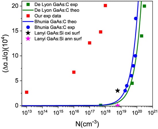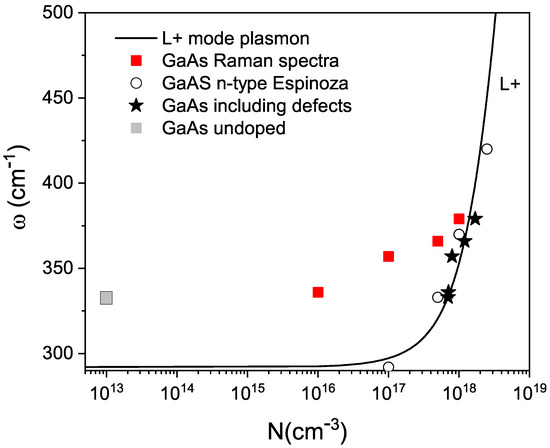 In Figure 7, the theoretical L+ plasmon scattering curve obtained from Espinoza’s thesis [43] is depicted. In this figure, we have overlaid the experimental values obtained by Espinoza for n-type GaAs. Similarly, we have superimposed the experimental values of the position of the maximum peak of the L+ band, based on the impurity concentration measurement made in 1995 and represented by red squares. For undoped GaAs, a native defect concentration of cm−3 was assumed, because that is the value that has been measured in undoped GaAs. This is indicated by a gray square in the figure. Clearly, our experimental results do not align with the theory in this manner. The discrepancy is due to the fact that carriers contributed by defects that have arisen due to aging were not taken into account. Adding a defect concentration of cm−3 to each of the impurity concentration values results in the outcome indicated by the black stars in the figure, which shows very good agreement.