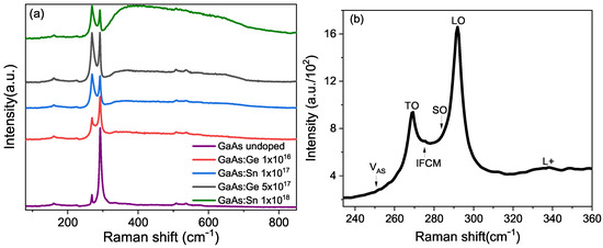 The Raman spectroscopy produced the results shown in Figure 6 for some of the samples. The literature shows two strong peaks for undoped GaAs: one at 292 cm−1, assigned as an LO phonon, and another at 268 cm−1, assigned as a TO phonon [37]. Additionally, weak responses can be distinguished in the region between 130 and 250 cm−1, corresponding to acoustic phonons [38], and two small peaks between 500 and 550 cm−1, called 2TO [39]. Figure 6a shows that in undoped GaAs, the TO peak is very small compared to the LO, but as the concentration grows, it gradually increases as a function of concentration. The reason for this is that the TO phonon is forbidden for a (100) geometry with normal backscattering of the Raman laser beam [40], as demonstrated in our measurements. Therefore, the appearance and increase of the TO peak indicate a loss of symmetry caused by impurities.