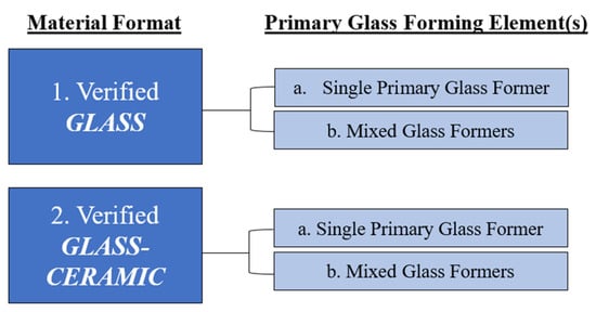 Both material formats were divided and further characterized according to the primary glass-forming element(s) incorporated into each network. Articles investigating glasses/glass-ceramics including only one glass-forming element (e.g., B, Si, P, Ge) in the network were grouped into the (a) single primary glass former category, whereas those that had multiple glass-forming elements (≥2) (e.g., borosilicate, borophosphate, and phosphosilicate) were grouped into the (b) mixed glass formers category. For enhanced clarity, papers that examined multiple glass compositions arising from a baseline glass (i.e., engineered with a single glass-forming element), in particular, those which substituted or otherwise added small amounts of additional network formers [26,30], were grouped based on the baseline glass former.