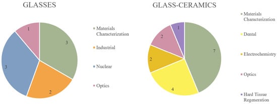 Areas of indication (and number of articles per area) for articles investigating glasses and glass ceramics.