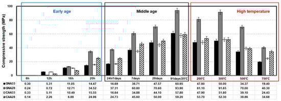 Figure 3 shows the results for the concrete compressive strength under the three conditions. The compressive strength converged to zero because none of the specimens that elapsed for approximately 6 h at an early age expressed their properties as elastic bodies []. After approximately 16 h, all specimens except CAA28 expressed approximately 10 MPa. After approximately 20 h, GNA28 showed about 20.05 MPa higher than that of GNA33, and CAA28 showed about 9.41 MPa higher strength than CAA33.