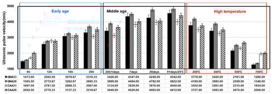 - In the ANOVA result of the compressive strength at an early age, the p-value was 0.05 or more, indicating insignificance. However, in middle age, all compressive strengths were significant except for GNA28. The compressive strengths of the specimens after high-temperature exposure exhibited significant differences between the groups, except for GNA33 and CAA33. On the contrary, UPV did not show a significant difference for concrete at an early age or after high-temperature exposure, except for the middle-age condition.