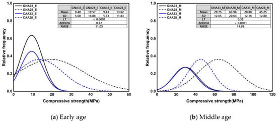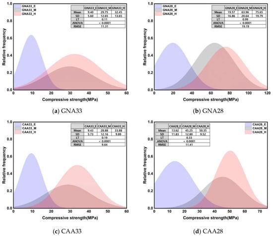 Figure 8 shows the normal distribution of the compressive strength and the results of the significance test according to the three conditions. Under all conditions, the mean and standard deviation of GNA33 and CAA33 were similar; however, compared to CAA28, GNA28 showed a markedly higher mean of approximately 45.08% and a higher standard deviation of approximately 70.56%. In addition, the mean and standard deviation of the specimen with a W/C ratio of 0.28 were higher by approximately 84.31% and 69.51%, respectively, compared to those of the specimen with a W/C ratio of 0.33. Only the results of Levene’s test on compressive strength at an early age suggested heteroscedasticity behavior under a p-value of 0.05 or less; nevertheless, the ANOVA results showed insignificant results with a p-value of 0.05 or more. Additionally, the RMSE values were similar under all conditions.