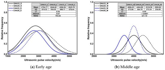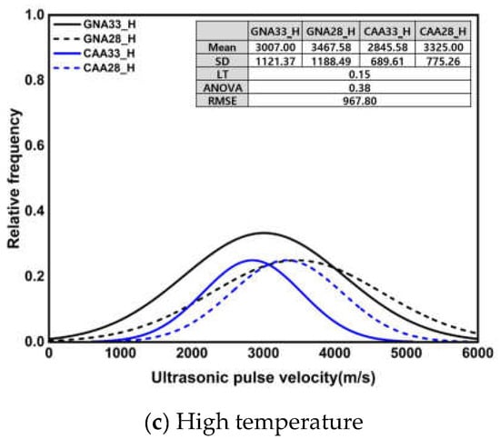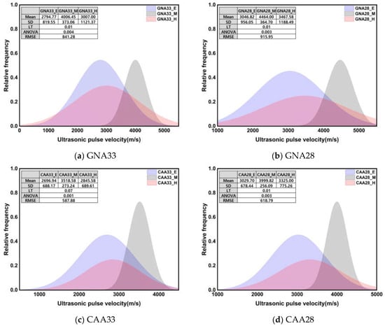 Figure 7 shows the normal distribution of UPV and the results of the significance test according to three conditions. All Levene’s test results showed heteroscedasticity with a p-value of 0.05 or less, and Welch’s ANOVA results also showed a significant difference between groups with a p-value of 0.05 or less. Unlike the compressive strength, the average and standard deviation of the UPV showed similar values at an early age and after high-temperature treatment. Under the early age and high-temperature conditions, the UPV mean was approximately 24.11% lower than that under the middle-age condition, while the standard deviation was approximately 273% higher. The observed disparities in the statistical results can be attributed to the distinct behavior of UPV at an early age compared to compressive strength: at an early age, UPV exhibited a relatively high rate of increase over the course of the curing time, unlike compressive strength. Meanwhile, during high-temperature treatment, UPV decreased significantly, indicating severe deterioration. The impact of high temperature on UPV, in contrast to compressive strength, is particularly noteworthy and contributes to the observed variations in the statistical outcomes.