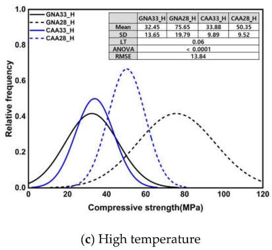 Figure 6 shows the normal distribution of compressive strength and the results of the significance test according to three conditions. The results of the compressive strength analysis under the three conditions are shown as mean, standard deviation, Levene’s test results, ANOVA, and root mean square error (RMSE). All Leven’s test results showed equal variance with a p-value of 0.05 or more for all specimens, and the resulting ANOVA results showed a significant difference between groups with a p-value of 0.0001 or less. The compressive strength at an early age showed a notably low mean compared to other conditions, while the mean at middle age and after high-temperature treatment was comparable. The standard deviation also showed the lowest value at an early age, stemming from the influence of the intensity expression range. Notably, GNA28 displayed the highest standard deviation value, attributable to the wider intensity expression range compared with the other specimens. Additionally, the RMSE results highlighted that GNA28 had the highest value among the groups.
