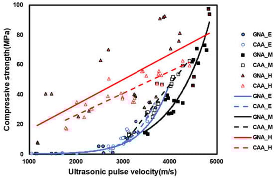 While various studies have attempted to formulate a comprehensive concrete strength prediction model using UPV, most have predominantly focused on comparing mechanical properties and model variances among different materials and mixing ratios. Unfortunately, there is a notable deficiency in analyses that explore the strength prediction model under diverse conditions (early age, middle age, and high temperature) and evaluate the discrepancies. UPV lacks a direct causal relationship with strength, but it is dominated by factors such as concrete voids, cracks, and elasticity of the matrix; thus, even with the same strength, different UPVs may appear depending on the matrix state [,,].