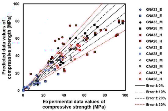 Figure 11 shows the error test results for the model shown in Figure 10. This was tested by setting the experimental data on the x-axis and the prediction data derived from the model on the y-axis. At an early age, the CAA specimen showed a small error compared with its GNA equivalent because the W/C ratio was statistically insignificant. However, because GNA33 and GNA28 showed statistically significant differences in terms of the W/C ratio, GNA33 showed high prediction accuracy, in contrast to GNA28.