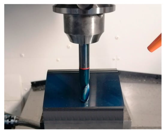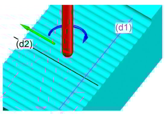 A flat surface was milled on a workpiece made of 90MnCrV8 steel (hardness 60 HRC) using a 12 mm diameter, 3 flute, TiAlN coated carbide ball nose end mill (as GARANT Diabolo solid carbide ball nose slot drill HPC 12 mm, from the Hoffmann Group, Bucharest, Romania), tilted at 25 degrees to the pick direction and perpendicular to the feed direction, with the following cutting regime parameters: 5200 rpm, 1560 mm/min feed rate, constant axial cutting depth of 0.1 mm and 0.4 mm step over (with theoretically equal pick-interval scallops height []). Figure 1 shows a conceptual description of the down milling process (with the workpiece in cyan, the tool in red, the feed direction in green, and the direction of rotation in blue). The magenta-coloured straight line (d1) represents the pick direction, and the black straight line (d2) represents the feed direction, with both conventionally used for experimental sampling of 2DRP. Figure 2 shows a view of the tool and workpiece (with the cutting process stopped) on an OKUMA GENOS M460R-VE CNC vertical machining centre (Charlotte, NC, USA).