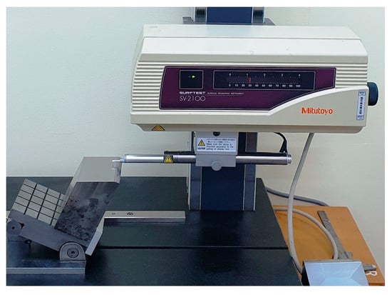 Figure 3 shows a view of the roughness sampling setup (using a SURFTEST SV-2100W4 contact profilometer, from Mitutoyo (Bucharest, Romania), with 0.0001 μm resolution, 2 μm stylus tip radius), with the flat milled surface placed in a horizontal position (here for sampling in pick direction).