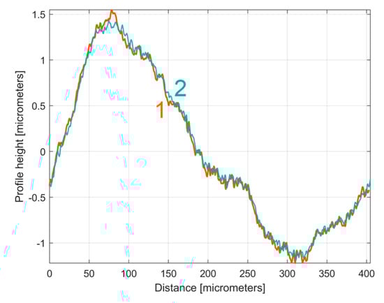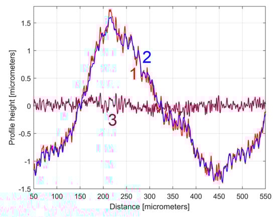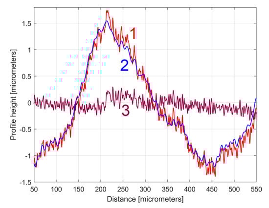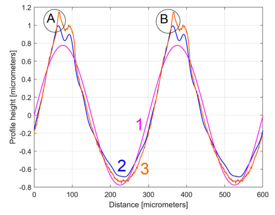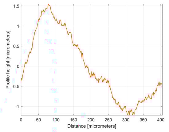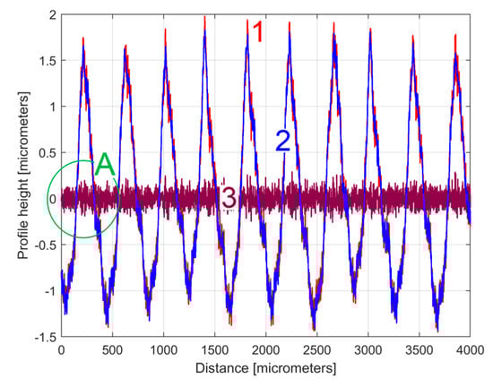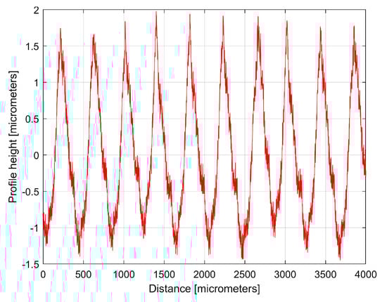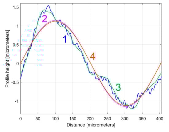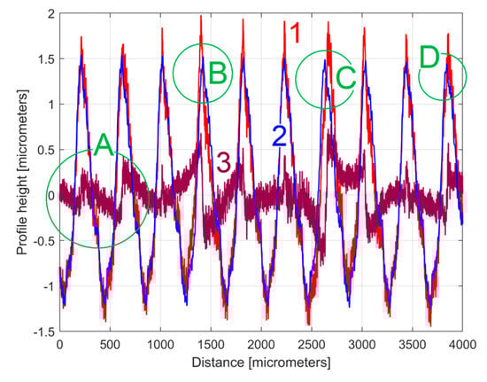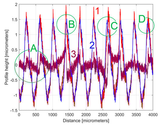 As an equivalent to Figure 10, Figure 16 shows this new 2DRP (as y(x), in red) with the same number of samples (8000) and sampling interval (Δx = 0.5 μm), overlaid with the ydh(x) profile (in blue) and the residual (in purple). This time only 12 harmonically related sinusoidal components inside ydh(x) were found (Table 2) among the 122 sinusoidal components in yd(x). The areas A–D mark some mismatches between the y(x) and ydh(x) profiles.