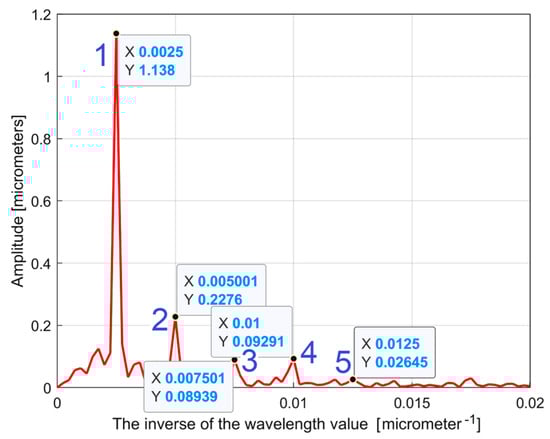 Figure 5 shows a partial view of the FFT spectrum of this 2DRP with real amplitudes (in Matlab). The 2DRP from Figure 4 was processed with FFT as a time-dependent signal (the x-coordinates of the samples are seen as signal samples time; the y-coordinates are seen as signal level). The sampling interval Δx on the x-axis (Δx = 0.5 μm) is seen as the conventional sampling period Δt on the t-axis. An x-coordinate on the x-axis of Figure 5 is equivalent to a conventional frequency or the inverse of a conventional period, or the inverse of a wavelength λ. A peak on the FFT spectrum (e.g., the highest peak 1, represented by an x-coordinate of 0.0025 μm−1 and a y-coordinate of 1.138 μm) indicates that there is a dominant sinusoidal component in the 2DRP with wavelength λ = 1/x (e.g., λ1 = 1/0.0025 = 400 μm for peak 1). This is exactly the step over value (pick feed) previously highlighted. In Figure 5, some other relevant peaks (2, 3, 4, and 5) represent sinusoidal components, harmonically correlated with the dominant, having the wavelengths λ1/2 = 200 μm, λ1/3 = 133.(3) μm, λ1/4 = 100 μm, and λ1/5 = 80 μm. The conventional sampling period Δt = 0.5 μm corresponds to the sampling frequency (rate) fs = 1/Δt = 2 μm−1 which is a conventional Nyquist limit (frequency) of fNq = fs/2 = 1 μm−1. In other words, the smaller synthetically describable wavelength of a sinusoidal component within the 2DRP by FFT spectrum is defined as λmin = (fNq)−1 = (fs/2)−1 = 1 μm.