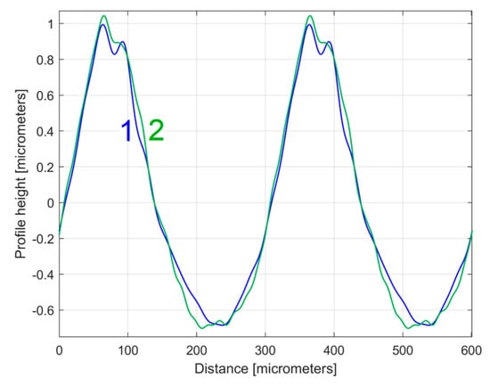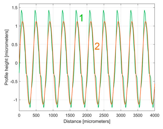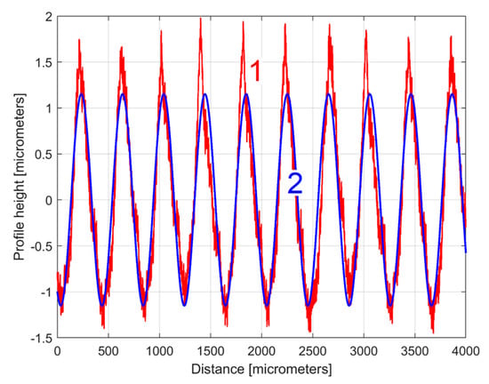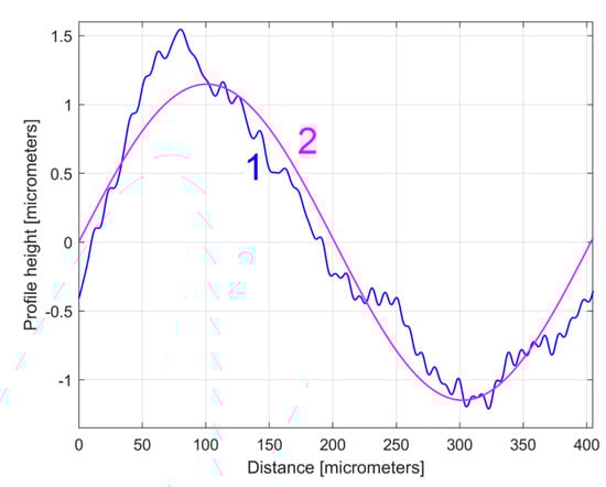 1—The 2DRP from Figure 4; 2—The first (dominant) sinusoidal component (yd1(x)) found by curve (signal) fitting (Equation (2)).