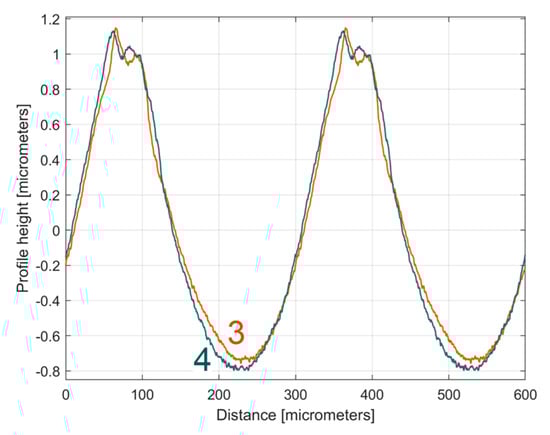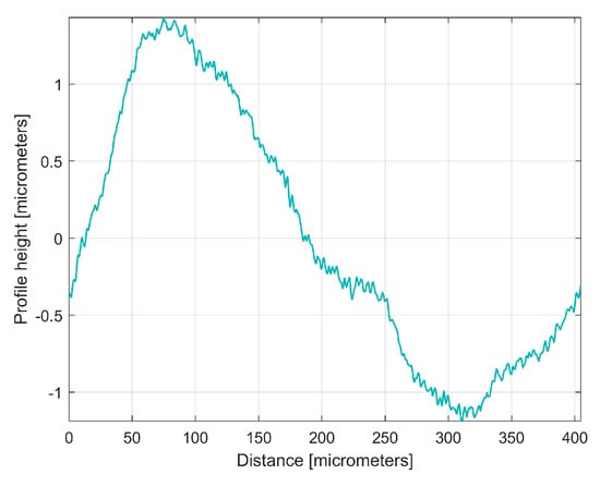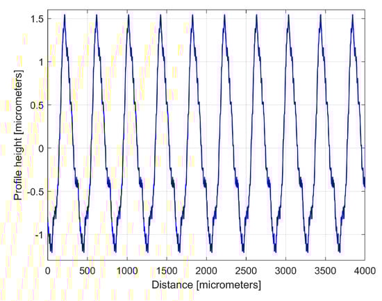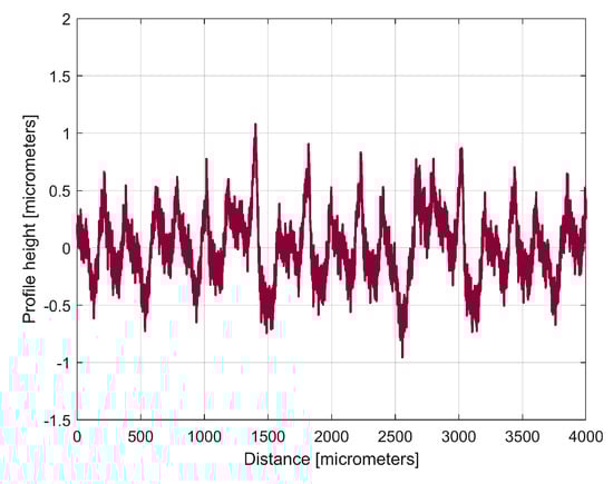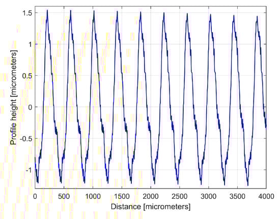 The numerical description of a 2DRP is delivered as a two-column .txt file describing N = 8000 equidistant samples (Δx = 0.5 μm sampling interval between samples on the x-axis, for a total distance of 4 mm). This file can be easily loaded into Matlab R2019b and analysed as a time-dependent signal (by FFT and curve (signal) fitting). Figure 4 shows a 4 mm long 2DRP, sampled in the pick direction (plotted in Matlab).
