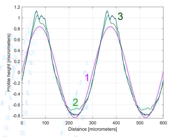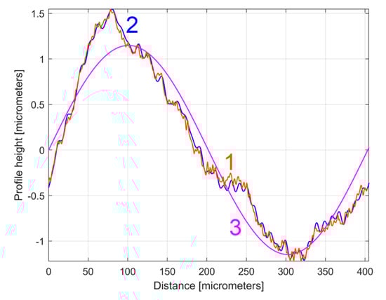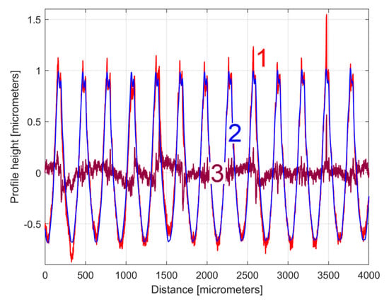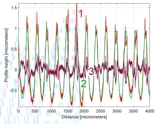Figure 30 shows a first 2DRP sampled in the feed direction (coloured in red), the deterministic harmonically correlated part ydh(x) (as a sum of 11 components, coloured in blue), and the residual r11(x) coloured in purple. Figure 31 shows the overlap of the first two periods of the dominant H10 (curve 1), the first two periods of the profile ydhe0(x) (curve 2), and the pattern yap0(x)—with m = 11—extrapolated on two periods (curve 3). As expected, there is a relatively good fit between them.