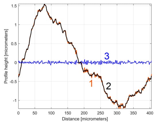 The curve (signal) fitting procedure (using the Curve Fitting Tool from Matlab) allows for the values of Aj, ωj, and φj to be determined with a good approximation. A sine model (as f(x) = a1*sin(b1*x + c1)) was used for a first fit, with x—coordinates as X data and y—coordinates as Y data. In this model, a1, b1, and c1 play the role of A1, ω1, and φ1 values in defining the first sinusoidal component yd1(x). The first curve fit gives A1 = 1.151 μm, ω1 = 0.01558 rad/μm, and φ1 = 4.1871 rad, whereby typically this curve fitting procedure finds the description of the highest amplitude component. It systematically searches for those suitable A1, ω1, and φ1 values that satisfy the condition: . This first sinusoidal component yd1(x) is shown (as dominant) in blue in Figure 6, superimposed on y(x), shown in red (an evolution already described in Figure 4). The component yd1(x) can be described mathematically as: