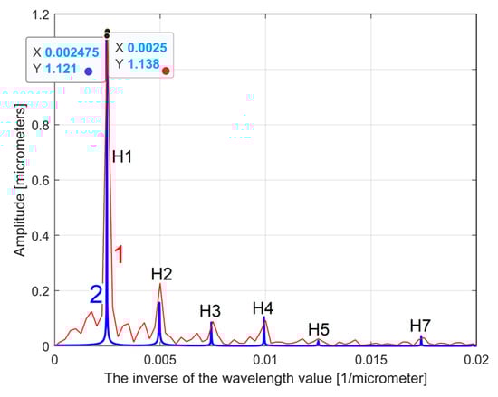 A partial view of the FFT spectrum: 1—of the y(x) profile; 2—of the extrapolated ydhe(x) profile, with p = 10. The peaks H1–H7 depict harmonic correlated components.