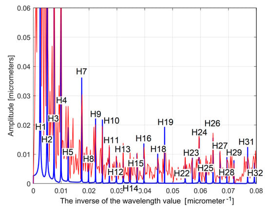 As a first example, related by the first 2DRP, Figure 26 shows partially (in the range 0 ÷ 0.02 μm−1 of conventional frequency) the FFT spectrum for the y(x) profile (in red, a spectrum already presented before in Figure 5)—and for the extrapolated ydhe(x) profile (in blue, with p = 10). Figure 27 presents both spectra over an extended conventional frequency range (0 ÷ 0.08 μm−1), with the first 27 harmonic correlated sinusoidal components (with ωHi= Hi ·ωHe1).