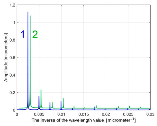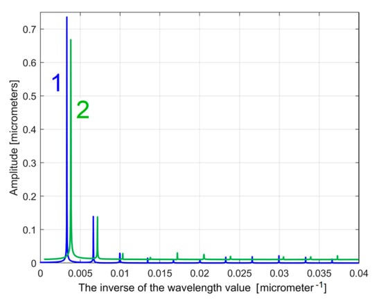 It is also possible to make a comparison between the FFT spectra of the extrapolated ydhe(x) profiles of both 2DRPs, with p = 10, as Figure 39 indicates, with zooming in on the y-axis, as shown in Figure 40. For easier comparison, the FFT spectrum of the extrapolated ydh(x) of the 2nd analysed 2DRP has been artificially shifted by 0.01 μm upwards and 0.0005 μm−1 to the right.