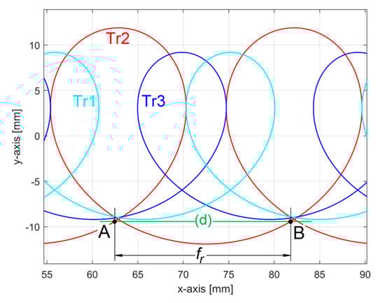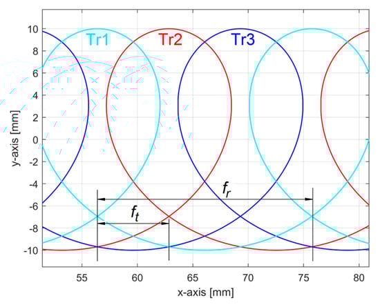 Unexpectedly, the conventional angular frequency ωHe1 = 0.020921 rad/μm defines the wavelength λHe1 = 2π/ωHe1 = 300.32 μm, as a conventional period, three times greater than the feed per tooth (100 μm), but practically equal to the feed per rotation fr of the milling tool. This means that the 2DRP in the feed direction reveals an abnormal behaviour of the milling tool, since because it turns off of its axis (with run out []), a single tooth is involved in the definition of the final machined surface (roughness). Obviously, the theoretical 2DRP in the feed direction consists mainly of a group of 2D curve (trochoidal) arcs, as parts of the trajectories of points on the teeth cutting edges. Figure 32 shows a conceptual simulation (without milling tool run-out) of these identical trochoidal trajectories (Tr1, Tr2, and Tr3) at a high feed rate (for clarity of approach). Figure 33 describes these trajectories with a particular run-out of milling tool: the centre of tool rotation is in opposite direction to the point involved in generating the trajectory Tr2. In both figures, for down milling, the theoretical 2DRP is described by arcs between the lowest intersection points of the trajectories.