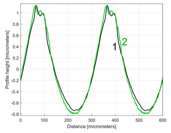 A similar study can be made on the 2DRPs sampled on the same machined surface, in the feed direction, parallel to (d2), under identical conditions, number of samples, and sampling rate (sampling interval). Each of these 2DRPs is expected to describe a periodic succession of feed-interval scallops, as traces left by the tips of the milling tool edges during its rotation and feed motion. For a milling tool having three teeth, a 5600 rpm rotation speed, and a feed rate of 1560 mm/min, the conventional period of these feed-interval scallops should be equal to the feed per tooth ft = 0.1 mm.