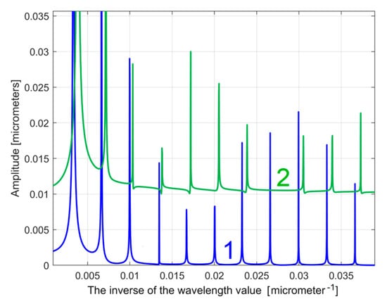 A partial view of the FFT spectra of extrapolated ydhe(x) profiles with p = 10; 1—for 1st 2DRP; 2—for 2nd 2DRP (shifted).