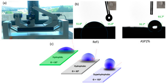 Contact-angle experimental procedure: (a) equipment; (b) frame of the contact-angle measurement; (c) schematic representation of the surface’s classification as a function of the water contact angle (θ).