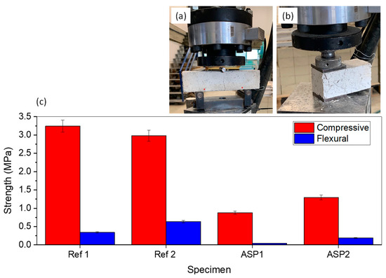 As far as the flexural strength is concerned (Figure 5, blue bars), as noted above, the values obtained were much lower than those observed for compression. However, the addition of 4% of ASP also led to an increase in the flexural strength value when compared to ASP2%, demonstrating the advantage of incorporating a higher percentage of powder. In ASP2% and ASP4%, there were decreased values of 88% and 44%, respectively, with respect to the reference mortar Ref1. Concerning Ref2, there was a decrease of 94% (ASP2%) and 70% (ASP4%).