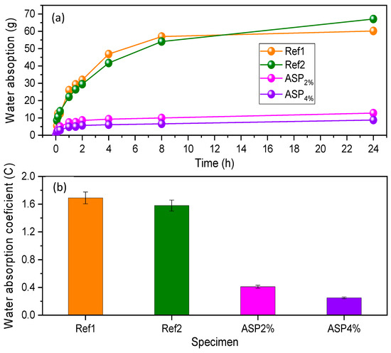 The results of the water absorption by capillarity test following EN 1015-18 [27] and EN ISO 1514 [28] are depicted in Figure 6a. It is possible to observe that Ref1 was the sample that absorbed the greatest amount of water. ASP2% and ASP4% presented a slight variation in weight, demonstrating that they both absorb a small amount of water. ASP4% absorbed less than ASP2%, a result that may be related to the increase of ASP content in the mixture. These results can be originated by the use of ASP at the microscale and the application of the particle-dispersion technique, which are in accordance with the mechanical results. There is a significant difference between Ref1, which absorbs 13% of its weight in water after 24 h, and ASP2% and ASP4% samples, which absorbed only 3% and 2%, respectively.